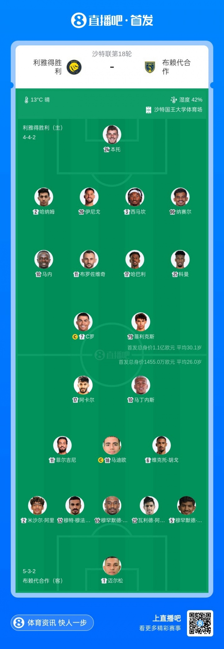胜利首发:24-本托、2-哈纳姆、3-西马坎、26-伊尼戈-马丁内斯、96-纳赛尔、11-布罗佐维奇、17-哈巴利、21-科曼、10-马内、79-菲利克斯、7-C罗