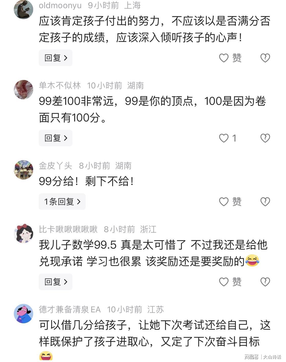 近日,杭州一个妈妈给女儿许诺,期末单科考100分奖300,三科全满直接给900。结果女儿考了语文95、数学99、英语99,就差那么一点点。